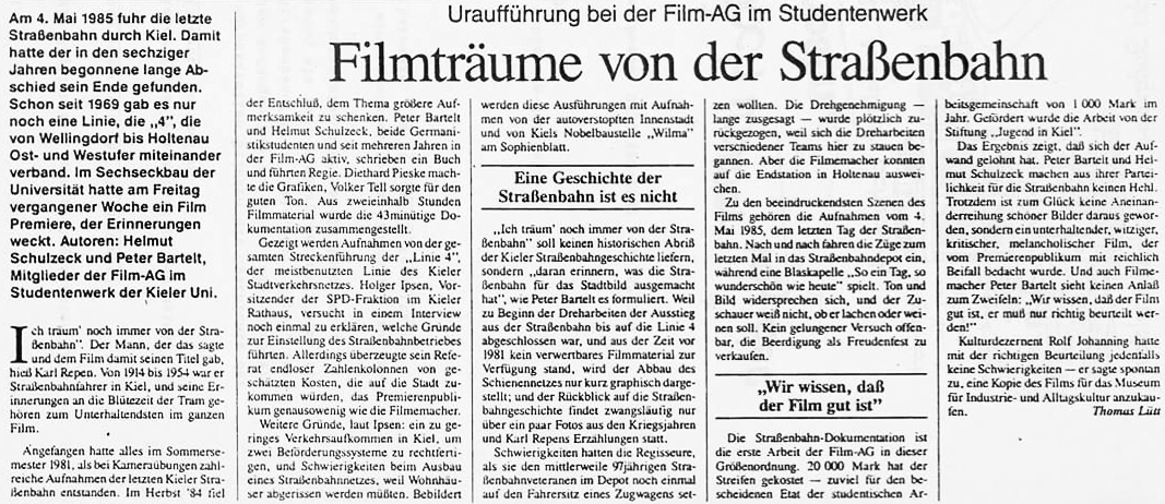 FilmFörde #18 zeigt: Zwei Filme über die Kieler StraßenbahnIn Erinnerung an die Kieler Straßenbahn, die am 4. Mai 1985 ihren Betrieb einstellte, lassen zwei sehr verschiedene Filme das heute für die Fördestadt so fremde Verkehrsmittel noch einmal lebendig werden. Die Kieler Straßenbahn: Mit der Linie 4 durch die Stadt(Kay Gerdes und Ulrich Sodemann, D 1984-85, 44 Min.) Die Fahrt geht vom Ostufer der Stadt bis zur Endstation am Nord-Ostsee-Kanal und vermittelt das „echte“ Fahrgefühl auf dieser Strecke mit den typischen Ausblicken auf die Kieler Stadtbilder. Historische Fotos und altes Filmmaterial ergänzen die lebendige Darstellung dieses „urigen“ Verkehrsmittels. ![]() Ich träum’ noch immer von der Straßenbahn(Peter Bartelt und Helmut Schulzeck, D 1981-1986, 45 Min.) „Am 4. Mai 1985 kurvte sie zum letzten Mal durch Kiels Straßen: Die Straßenbahn, von vielen geliebt und zum Schluss zäh, aber vergeblich verteidigt ... Ihr haben Peter Bartelt und Helmut Schulzeck ein filmisches Denkmal gewidmet ... Was das Auge der Kamera damals sah, wirkt heute wie ein wehmütiger Blick zurück: Auf der Fahrt durch die romantisch fotografierte Stadtlandschaft, durch Sonne und Schnee mutet die gute alte Bahn an wie ein Vehikel aus jenen Tagen, in denen Beschaulichkeit und Komfort mehr galten als Geschwindigkeit und Rationalisierung. Den gleichen Kontrast nehmen auch die Interviews auf. So stehen die anekdotenreichen Erzählungen des fast 100-jährigen Karl Reepen aus 40 Jahren Berufsleben als Straßenbahnfahrer im krassen Gegensatz zur illusionslosen Nüchternheit, mit der SPD-Kommunalpolitiker Holger Ipsen jene wirtschaftlichen Zahlen und planerischen Fakten vorlegt, denen die Straßenbahn geopfert werden musste.“ (Christoph Munk, KN, 1986) ![]() ![]() Artikel in der „Kieler Rundschau“, 1986 (größere Ansicht)FilmFörde #18: Do, 12.10.2017, 19 Uhr, Kulturforum in der Stadtgalerie Kiel (Andreas-Gayk-Str. 31) |