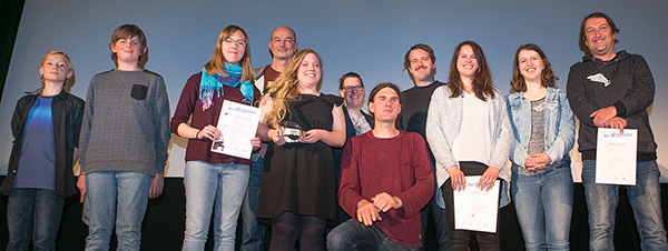 Kurzfilmwettbewerb „Nur 48 Stunden“Filmpreise für halbe Hähnchen, Endstationen und ein „Haimweh“42 Filmteams skripteten, drehten und schnitten vom 17. bis 19. Mai für den Kurzfilmwettbewerb „Nur 48 Stunden“. 14 kamen ins Finale im metro-Kino und zeigten, wie kreativ sie mit dem Motto „Endstation“ und den drei Vorgaben umgehen. Der Jury, die drei Jürgen-Prediger-Filmpreise verlieh, fiel die Wahl sehr schwer. Kurzfilme lassen sich mit den heutigen digitalen Mitteln sehr schnell produzieren. Dennoch bleibt eine berührende Geschichte das wichtigste am Film. Das zeigte erneut der Filmwettbewerb „Nur 48 Stunden“. Das Motto „Endstation“ und die drei thematischen Vorgaben (ein Versprecher, eine Yoga-Übung sowie die Namen des Siegerpaars aus der TV-Show „Let’s Dance“) setzten die Finalisten augenzwinkernd und beim Publikum im ausverkauften metro-Kino viel Heiterkeit auslösend um. ![]() (1. Reihe v.l.): Tim Bielefeldt, Niklas Niemeyer (Nachwuchspreis für „Terra“); Laura Gragert, Jantje Knecht (1. Preis für „Zwei halbe Brathähnchen“); Frank Schmerschneider, Jackie Gillies (3. Preis und Publikumspreis für „Endstation“); Leonore Reuleke, Claus Richnow (2. Preis für „Haimweh“) – (2. Reihe, v.l.): Jury: Matthias Fey, Julia Gläsker, Felix Arnold (Foto: Björn Schaller)Aus zwei halben Brathähnchen wird ein ganzer Liebesfilm So auch beim 1. Jürgen-Prediger-Filmpreis (benannt nach dem verstorbenen Kieler Schauspieler Jürgen Prediger, dotiert mit 350 €), den die Jury (Matthias Fey, Felix Arnold und Julia Gläsker) „Zwei halbe Brathähnchen“ von Jantje Knecht zusprach. Denn „nichts ist romantischer als zwei halbe Single-Hähnchen“, die sich an Knuts Hähnchen-Braterei zusammenfinden – zur Liebe, die durch den Magen geht. Um die Liebe geht es auch im „Kopfkino“ von Junit Weber, wo ein Zufallspaar in einem Schnellrestaurant nur träumt, was aus ihnen „am Ende“ werden könnte, bis einer sich verschluckt ... Liebesweh zur Fördeheimat plagt einen Hai im Zeichentrickfilm „Haimweh“ von Leonore Reuleke (2. Jürgen-Prediger-Filmpreis, 150 €). Wenn er nach langer Odyssee an der „Endstation Kieler Hauptbahnhof“ ankommt, ist das sein „Haimat“-Hafen. „Nur 48 Stunden“ vereint die Kieler Filmszene „Professionellen Dilettantismus“ macht die Jury ironisch in „Endstation“ von Jackie Gillies (3. Jürgen-Prediger-Filmpreis, 100 €) aus. Jackie Gillies und ihr Team thematisieren den Wettbewerb selbst, indem sie nach dem „optimalen Schauspieler“ suchen, der leider schon von den anderen Teams gebucht ist (z.B. Thies John, der in drei Filmen auftritt). Frau „rächt“ sich, indem sie den anderen Teams am Set auflauert. Die, wie Johann Schultz an der Arbeit für „Aufwärts“, machen gern mit, denn in der schleswig-holsteinischen Filmszene ist man eh in Personalunionen vernetzt und ohne Konkurrenzen vereint. Hier drehen alle an derselben Filmkurbel. Kein Wunder also, dass auch der von den Stadtwerken Kiel gestiftete Publikumspreis (150 €) an „Endstation“ ging. Nachwuchs ganz „retro“ vorn Erst 12 und 13 Jahre alt sind Tim Bielefeldt und Niklas Niemeyer. Für ihr Endzeit-Szenario „Terra“ (Nachwuchspreis, 50 €) setzen sie eine Drohnenkamera ein und spielen souverän mit Filmzitaten aus „Star Wars“ und Co. Apropos Filmzitate: Torben Sachert und Olli Ott sind darin das Dreamteam. Fast schon zu aufwändig produziert ist ihr „Tarantino-Like“ „Liar’s Dice“. Aber auch schön lügen können muss man als Filmemacher im ganz großen 48-Stunden-Kino. (jm) Alle Filme des Wettbewerbs werden am Sonnabend, 1.6.2019 im Offenen Kanal gezeigt und hernach in der Mediathek unter www.okkiel.de. Weitere Infos: www.jugendundfilm.de/cms/nur-48-stunden/ |
