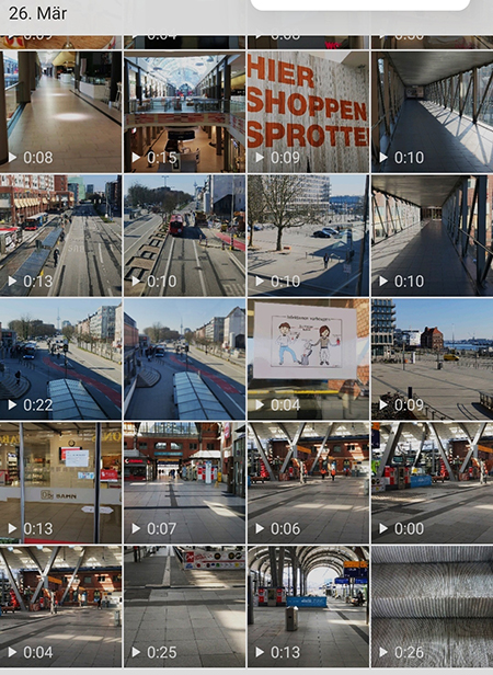 Sag mir, wo die Kieler sind„Corona-Kiel, 26.03.2020“ (D 2020, 4:23 Min., Regie: Helmut Schulzeck)Eigentlich sollte ich doch mal die leeren Straßen Kiels filmen, dachte ich an einem späten Donnerstagmorgen, Ende März 2020. Denn so entvölkert wie zu Corona-Zeiten sieht man tagsüber die Kieler Innenstadt sonst nie. Gesagt, getan, zog ich mit meinem chinesischen Smartphone Xiaomi Mi9 (erstanden bei Gearbest, dem Online-Händler aus Shenzen) los von meiner Wohnung, die nur Minuten vom Hauptbahnhof entfernt liegt. Am Sophienblatt Ecke Herzog-Friedrich-Straße machte ich meine ersten Aufnahmen, schlenderte weiter zum Bahnhof, dann rüber zum Einkaufszentrum Sophienhof, durch die Fußgängerzone bis zur so genannten Kieler Altstadt. ![]() Der Kieler Hauptbahnhof buchstäblich als Stillleben am Anfang des Clips (Fotos: Helmut Schulzeck)Ein elegisches Gefühl, kontrastiert mit fast lustvoll durchlebten sentimentalen Schauern, machte sich breit. Was für Bilder, was für Eindrücke? Ein helles Kiel im sonnendurchstrahlten, ostwindkalten Frühlingswetter. Wie leergefegt. Und diese Leere wirkte je leerer, desto singulärer sich ein paar Passanten darin verloren. Ein schläfriger Straßenmusikant mit seinem Akkordeon vorm Drogeriemarkt hockend. Eine grüne Bikerjacke mit Träger in zugiger Eile die ungewohnte Freiheit durchradelnd. Ein, zwei PKWs in staulosem Erstaunen auf ödem Asphalt. Selbst die Ersatz-Kieler, die Touristen, die sonst hier vertretungshalber ihre Saison pflegen, sprudelten nicht durch die Stadt. ![]() Szenenmaterial auf dem HandyEs war so wie sonst am ersten Tag der Sommerferien. Die Fördestadt hatte ihre Bordsteinkanten hochgeklappt und schien vor sich hinzudösen. Der Alltag hatte frei, ewiger Sonntag schien angebrochen. Fast menschenlos: „Sag mir wo die Kieler sind. Wo sind sie geblieben?“ – Zwei Tage später zog ich noch einmal los. Diesmal begleitet von Bernd Fiedler und seinem kleinen Camcorder, mit dem er schon seit Jahren wie verwachsen scheint. Insgesamt spazierte ich so alleine und zu zweit rund 300 Minuten durch die Landeshauptstadt und blieb dabei Drohnen-frei auf dem Boden der Tatsachen so zu sagen, ohne der Versuchung zu erliegen, die Bilder zusätzlich zu ihrem dokumentarischen Charakter noch zu ästhetisieren. ![]() Co-Kameramann Bernd Fiedler auf dem menschenleeren HolstenplatzSo langatmig wie diese Corona-Pandemie auf einer ungeduldigen Welt lastet, so flüchtig wirken diese Bilder schon jetzt wenige Wochen später, Ende April 2020, auf mich. Obwohl bzw. weil dieser viereinhalb Minuten kurze Clip mit dem Titel „Corona-Kiel, 26.03.2020“ relativ oft gesehen wurde (auf Facebook über 14.000 mal, auch häufig weiter gepostet), wurde er auch viel gescholten. Besonders die unterlegte Musik, „Robo Dance“, ist für viele gewöhnungsbedürftig mit ihrem, ruppigen elektronischen Klang, ihrem stolpernden Rhythmus und ihrer beim ersten Hören uneingängigen Melodie. Viele wollen nicht verstehen bzw. akzeptieren, dass ich mit dieser relativ unorthodoxen Instrumentalisierung einer zu unterhaltsamen Aufnahme des Films entgegenwirken will. Mögen manche Bilder der Leere auch noch so schön und großartig wirken, Corona bleibt tragisch, ist ein sehr großes Unglück. (Helmut Schulzeck) „Corona-Kiel, 26.03.2020“. D 2020, 4:23 Min.; Kamera: Helmut Schulzeck und Bernd Fiedler; Musik: „Robo Dance“ (musicfox.com); Buch, Schnitt und Regie: Helmut Schulzeck. Eine ElektronikKlumpenFilmprorduktion, Helmut Schulzeck |