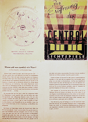 „Warum geht man eigentlich ins Kino?“, fragen Klaus Scepanik und Hans-Joachim Nagel in einer kleinen Broschüre zur Eröffnung der Kieler „Central Lichtspiele“ (14. Juni 1951), um dann in einer kurzen „Betrachtung“, wie sie es nennen, „den besonderen Wert des Films … in seiner fast unbegrenzten Vielfalt der Möglichkeiten“ zu preisen. Der weitere Text ergeht sich in einigen kurzen Absätzen über die Vorzüge der verschiedenen Filmgenres und mündet schließlich in die abschließende Feststellung: „Das neuzeitliche Filmtheater bietet zu erschwinglichen Preisen eine Vielfalt von Unterhaltung, Wissensbereicherung, Entspannung und angenehmen Aufenthalt, wie kaum etwas anderes. Deshalb geht man so gern ins Kino.“