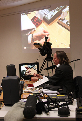 Die konkrete Tonarbeit am Set beginnt, wie für die meisten anderen Departments auch, mit dem Drehbuch. Anhand von Anzahl der Charaktere in einer Szene, Situation und Handlung kann bereits auf Dialogaufzeichnung, Atmo und charakteristische Geräusche geschlossen und das Equipment entsprechend logistisch geplant werden. Eine gründliche Vorbereitung und vorherschauende Auswahl des Materials bis hin zu einem vorteilhaften Stellplatz für das Tonfahrzeug am Set fördern einen reibungslosen Ablauf und die notwendige Flexibilität am Set. Die tatsächliche Aufnahme vor Ort erfordert darüber hinaus nicht nur Sorgfalt, sondern oft auch persönliche Autorität und Standvermögen, wenn im Anschluss an den Dreh einer Szene für die Tonaufnahmen von Atmo und Sondergeräuschen „Ruhe am Set!“ durchgesetzt werden muss. Außerdem besteht, so Zeigermann, „die Notwendigkeit, am Set gestalterisch einzugreifen, in gleicher Dringlichkeit wie für alle anderen Departments“. Komplexe Szenen erfordern oft die getrennte Aufzeichnung von Bild und Ton, wie Zeigermann anhand des anschaulichen Beispieles der Abschlussszene von „Chiko“ (Özgür Yildrim, D 2008) vorführte. Dialoge, Schreie, Kampfgeräusche etc. stehen separat zur Verfügung und gewährleisten eine größere Gestaltungsfreiheit beim Tonschnitt und der Tonmischung. Oberstes Gebot bleibt laut Zeigermann: „Die Schauspieler dürfen nicht beeinträchtigt werden, je mehr Freiheit sie haben, desto besser sind sie.“ ![]() Volker Zeigermann demonstriert den „Einbau“ eines unsichtbaren FunkmikrosDiese Regeln gelten sinngemäß und verstärkt auch für den Dokumentarfilm. Beim Umgang mit Dokumentarfilmprotagonisten ist gar psychologisches Fingerspitzengefühl vonnöten, soll der Interviewpartner nicht bereits durch das Verkabeln mit einem „unsichtbaren“ Funkmikrofon verunsichert und aus dem Konzept gebracht werden. Eine gründliche logistische Vorbereitung ist einleuchtender Weise für einen Dokumentarfilmdreh unabdingbar, ist man doch oft gezwungen, schnell und flexibel zu reagieren. Ein Weniger ist aber auch hier manchmal ein Mehr, denn je weniger Technik vor Ort zum Einsatz kommen muss, desto flexibler ist man. Dass die Arbeit als Tonmann oder Tonfrau kein Zuckerschlecken ist, daran ließ Volker Zeigermann allerdings keinen Zweifel: Das Sound Department muss sich nicht nur am Set durchsetzen und trotzdem am besten „unsichtbar“ bleiben. Leider fehlt oft auch das Verständnis für die technischen Anforderungen an eine qualitativ hochwertige Tonaufzeichnung. Insbesondere bei zunehmend schmaler budgetierten Fernsehdrehs setzt sich zusehends ein von Zeigermann pointiert betiteltes „Praktikantenfernsehen“ durch, dessen Verständnis für Tonarbeit gerade noch vom Funkmikro bis zur Klinkenbuchse an der Digitalkamera reicht. Mit ein paar Tipps aus der täglichen Praxis („Wie stecke ich ein Funkmikro unsichtbar und raschelsicher an?“) beschloss Volker Zeigermann seinen kurzweiligen und kompetenten Rundschlag zum Thema „Ton am Set“ ab und übergab thematisch nahtlos an die Dokumentarfilmerin und Sound Designerin Maria Hemmleb. „Wenn man das gleiche Geld wie in das Bild auch in den Ton stecken würde, bekäme man einen ungleich wirkungsvolleren Film“, zitierte Hemmleb den Film Editor, Sound Designer und Mitentwickler des Dolby Surround Verfahrens Walter Murch („Apocalypse Now“, USA 1979; „The English Patient“, USA/UK 1996). Der Tonschnitt ist eine weitere Gestaltungsebene im filmischen Prozess, sein Prinzip – analog zu dem des Filmschnitts – definiert und differenziert die Kunstform Film von allen anderen. Natürlich kann der Film Editor nicht ohne einen Synchron-Ton und eventuell wichtige charakteristische Geräusche oder Effekte arbeiten, deshalb legt er sie bereits grob an. Doch die eigentliche Gestaltung der Tonebene obliegt dem Sound Editor und für die finale Abmischung der einzelnen Tonebenen dem Sound Mixer. In diesem Arbeitsprozess fällt u. U. einem Geräuschemacher die Aufgabe zu, passende charakteristische Sounds nachträglich zu erzeugen, bzw. einem Effektspezialisten, elektronische Sounds zu generieren. Komponisten und Musiker sorgen für einen Score. ![]() Maria HemmlebZu den wesentlichen Gestaltungselementen zählen für Maria Hemmleb eine den filmischen Raum definierende Atmo, Dialoge und Kommentare, natürliche und synthetische Geräusche, Foleys und Soundeffekte sowie Musik. Drei wichtige Regeln legt Hemmleb ihrer Arbeit zugrunde: