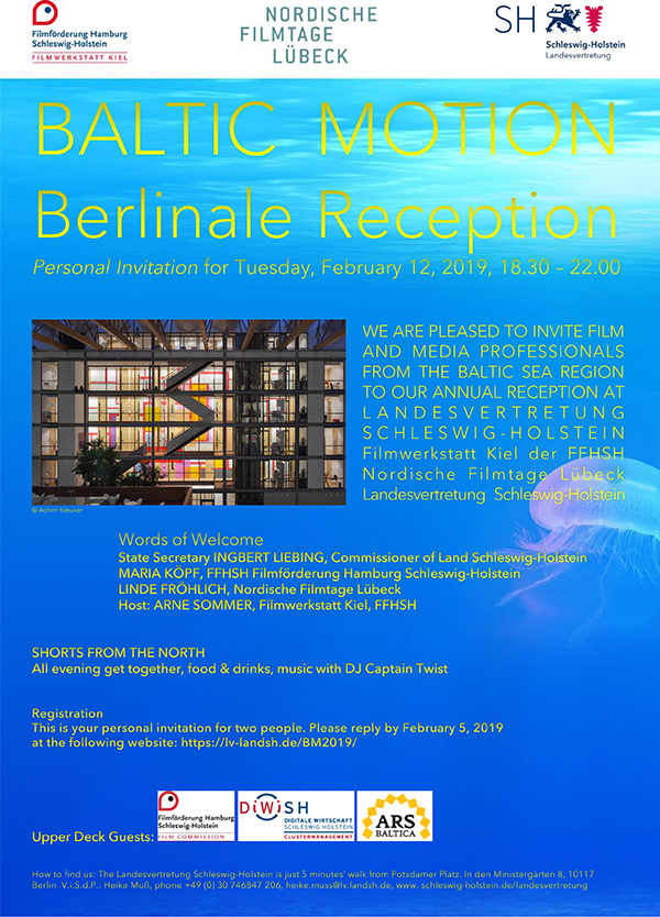 69. Int. Filmfestspiele Berlin – Berlinale 2019Einladung zur Baltic MotionAuch in diesem Jahr laden auf der Berlinale die Filmwerkstatt Kiel der FFHSH und die Nordischen Filmtage Lübeck in Zusammenarbeit mit DiWiSH und Ars Baltica zum Baltic Motion Empfang in der Landesvertretung Schleswig-Holstein ein. Dienstag, 12. Februar 2019, ab 18.30 Uhr. ![]() Grußworte sprechen: