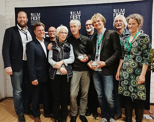 23. Filmfest SH 2019Das 23. Filmfest Schleswig-Holstein endete mit der Verleihung von zwei FilmpreisenMit einem abwechslungsreichen Kurzfilmabend und anschließender Ehrung der Preisträger ging am Abend des 11. Mai 2019 das 23. Filmfest Schleswig-Holstein im ausverkauften Kino in der Pumpe Kiel zu Ende. Festivalleiter Arne Sommer blickte dieses Jahr auf einen besonders starken Wettbewerb zurück: „Von Flensburg nach Kalifornien, aus der DDR ins Moor, aus der Vergangenheit in die Zukunft, geflüchtet, auf der Durchreise und angekommen in 360 Grad – selten wurde für mich so deutlich, wie sehr Schleswig-Holstein mit der ganzen Welt verbunden ist, wie wichtig es ist – künstlerisch und politisch – den Kopf nicht in den Sandstrand zu stecken, sondern wach mit der Filmlinse in die Welt zu blicken.“ Der neue Gesa Rautenberg Langfilmpreis für Wettbewerbsbeiträge ab 25 Minuten wurde von einer dreiköpfigen Jury vergeben. Die künstlerische Leiterin der Nordischen Filmtage Lübeck Linde Fröhlich, die Co-Geschäftsführerin des Filmbüros Bremen und Produzentin Saskia Wegelein, sowie Filmemacher und FFSH-Publikumspreis-Gewinner 2018 Kay Gerdes entschieden sich für den Dokumentarfilm „To B or to B flat“, ein Portrait des belgischen Komponisten Boudewijn Buckinx, von der gebürtigen Kielerin Viola Rusche und Hauke Harder. Ihre Begründung lautete: „Der Preis geht an einen Film, der Verwickeltes einfach macht und uns einen Menschen und Künstler nahebringt, mit dessen Schaffen wir wahrscheinlich sonst nie in Berührung gekommen wären. Hervorragender Ton und eine klare Kamera, fast minimalistisch, dabei ausdrucksstark und humorvoll wie der Protagonist und seine Musik, begeistern.“ Die mit 2.000 Euro dotierte Auszeichnung in Form eines Buddelschiffs wurde vom Vorstandsvorsitzenden des Preisstifters und Mit-Veranstalters Filmkultur Schleswig-Holstein e.V. Christoph Zickler übergeben. „Mit diesem Preis drücken wir unsere tiefe Wertschätzung für das Filmschaffen im Land Schleswig-Holstein aus und möchten damit zur Professionalisierung der hiesigen Filmszene beitragen. Im Gegenzug freuen wir uns jedes Jahr über Geschichten und Bilder, die uns berühren und neue Gedanken und Perspektiven eröffnen“ sagte Zickler. ![]() Die Preisträger: (v.l.) Viola Rusche und Hauke Harder (Gesa Rautenberg Langfilmpreis), Friedrich Tiedtke (Publikumspreis Kurzfilm) (Foto: jm)Außerdem wurde der Publikumspreis Kurzfilm SH an einen Beitrag aus dem vorangegangenen Kurzfilmprogramm verliehen. Über das Preisgeld in Höhe von 2.000 Euro, das auch in diesem Jahr von der PSD-Bank gestiftet wurde, konnte sich der Eckernförder Jungfilmemacher Friedrich Tiedtke mit seinem Film „Mann auf Blau“ freuen. Der Kurz-Dokumentarfilm erzählt die Geschichte des Meisterschülers Henri Haake, der seine Erfahrungen mit der Kunstwelt in einem Gemälde spiegelt. Der Vorstandssprecher der PSD-Bank Kiel eG Michael Kunkel übergab die Auszeichnung unter anhaltendem Beifall. ![]() Stolze Preisträger, Preisstifter und Jury: (v.l.) Christoph Zickler, Michael Kunkel, Daniel Krönke, Viola Rusche, Hauke Harder, Arne Sommer, Friedrich Tiedtke, Kay Gerdes, Saskia Wegelein (Foto: Anna Rowedder)Im Anschluss an die Preisverleihungen wurde in der Filmkultur Lounge der Abschluss des 23. Filmfest Schleswig-Holstein gefeiert. (nach einer Pressemitteilung des Filmfests SH) |