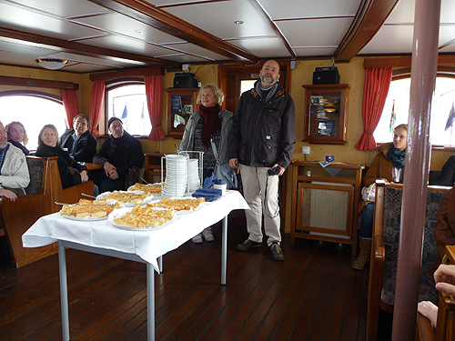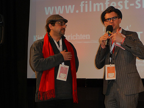 18. Filmfest Schleswig-Holstein 2014FilmfestsplitterBeginnen wir mit dem Ende: Als besonderer Clou der Preisverleihung erwies sich nach etwas langer Wartezeit auf die Preisjury am Samstag auf Sonntag gegen Mitternacht im Roten Salon der Pumpe die Veröffentlichung des mitgeschnittenen Telefonats mit Yael Reuveny. Nach sehr erfolgreicher Vorführung ihres Dokumentarfilms „Schnee von gestern“ („Farewell, Herr Schwarz“) zur Eröffnung des Filmfests Schleswig-Holstein war Reuveny am Wochenende in die USA weitergedüst, um dort auf Einladung ihren Film auf dem „JFilm Festival“ in Pittsburg und auf dem „First time Fest“ in New York City zu zeigen. Arne Sommer erwischte Reuveny an ihrem Handy auf dem Flughafen von New Jersey. Hocherfreut tröstete sie nach eigenem Bekunden die Nachricht vom Gewinn des Preises der Kulturellen Filmförderung Schleswig-Holstein über den Ärger der Flugverspätung hinweg. ### ![]() Yael Reuveny im Gespräch mit Festivalleiter Arne Sommer nach der Vorführung ihres Films (Foto: Jessica Kordouni)Ein neue, besondere Farbe brachte der Hamburger Filmemacher Jim Lacey mit seinen Moderationen und an die Filme anschließenden Gespräche mit den FilmemacherInnnen ins Festival. Seine „texanische“ Ironie und sein intelligenter, mit amerikanischer Aussprache gefärbter Humor wussten zu gefallen. ### ![]() Jim Lacey (r.) im Gespräch mit Kaweh Kordouni (Foto: Helmut Schulzeck)Erstaunlich und erfreulich, welch positive Aufmerksamkeit und Zuspruch die Installationen „Osmose“ von Urte Alfs und „Die innere Mission“ von Lene Markusen sowie die Performance „Fracht – Grenzen der Freiheit“ von Kolja Lehmann-Muriithi und Linn Marx fanden. Drohten in den vergangen Jahren solch Filmkunstbestrebungen bei Augenweide bisweilen eher als künstlerisch fantasievolle Dekoration im Kneipenraum der Pumpe wahrgenommen zu werden und im Festivaltrubel als Randerscheinung unterzugehen, so gelang es dieses Mal durch die besondere räumliche, zeitliche und progammliche Präsentation, diese Filmkunststücke eher als eigenständiges Filmgenre in einer besonderen Programmschiene sichtbar zu machen, was, wie gesagt, allseits goutiert wurde. ### Wie manche gut gemeinten und allseits begrüßten Vorschläge bzw. Neuerungen der Diskussion beim Workshop 1 an der harten Realität abprallen können, zeigte sich am Nachwuchsprogramm beim Filmfest. Von allen ausdrücklich gefordert und dann bei Einführung begrüßt war dieses Programm doch enttäuschend schwach besucht. Sicherlich spielte das Filmfest (nicht nur hier, doch sonst erfolgreicher) gegen das schöne Frühlingswetter am Wochenende an. Und für das Nachwuchsprogramm heißt es jetzt sicherlich nicht, dass es verkehrt war, dieses zu veranstalten. Nur erfordert es zum Erfolg noch kontinuierliche Beackerung und Pflege. ### „Eine Schifffahrt, die ist lustig, eine Schifffahrt, die ist schön…“: Zum erinnernswerten Erfolg wurde auch die von Antje Bremer (Film Commission Büro Kiel) organisierte Schifffahrt mit dem Museumsschiff „MS Stadt Kiel“ am Samstagmittag über die Kieler Innenförde. ![]() Arne Sommer und Antje Bremer begrüßen die Gäste auf der „MS Stadt Kiel“ (Foto: Helmut Schulzeck)Gerade noch rechtzeitig hatte sich der späte Märzennebel über Stadt und Wasser gelichtet und ermöglichte so bei strahlenden Sonnenschein ein einstündiges Vergnügen für das äußerst angetane Filmvolk, das bei Kaffee und Kuchen entweder den kundigen Erklärungen des ehrenamtlichen „maritimen Fremdenführers“ lauschte oder, auch außendecks, fachsimpelte und sich so filmisch näher kam. ### ![]() Dampferfahrt mit Filmvolk (Foto: Helmut Schulzeck)Die größte Zuschauerzahl des Festivals erreichte mit drei ausverkauften Vorstellungen der Erstlingsfilm „Nachbarn rollen vorüber“ von Linnéa Kviske und Michael Sindt, der sich mit dem Leben in einer Einrichtung für Schwerstbehinderte auseinandersetzt. ### Ein Highlight war mal wieder das Kurzfilmprogramm am Samstagabend, das nicht nur durch die Mischung von ernst und heiter überzeugte, sondern auch (zum wievielten Male?) mit Eckhard Pabst einen tollen Moderator fand. Mit seiner launigen Eröffnungsmoderation legte Pabst wieder einmal ein humorvolles, pointenreiches Kabinettsstückchen hin. Sein ironisches Lamento, dass er nicht als Festivalteam-Mitglied anerkannt würde, wurde von einem dankbaren, gutgelaunten Publikum mit breitem Gelächter quittiert. (Helmut Schulzeck) |