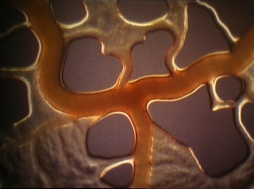 18. Filmfest Schleswig-Holstein 2014Triebkraft und Rhythmus des filmisch Lebendigen„Osmose“ (Urte Alfs, D 2011)Diffusion und die auf ihr beruhende Osmose sind physikalische Phänomene, die essentiell für alle Lebensvorgänge sind, beruht doch jeglicher Stoffaustausch zwischen Innerem und Äußerem der Zelle auf ihnen. Zahlreiche (historisch angestaubte) Lehr- und Wissenschaftsfilme, real oder animiert, verdeutlichen diesen Mechanismus und verschleiern in ihrem mechanistisch, ultra-dokumentarischen Gestus zugleich dessen rhythmische Lebendigkeit. Die Berliner Künstlerin Urte Alfs spürt diesem Rhythmus nach, indem sie das found footage der filmischen „Osmose“, der Montage, unterzieht. Dass sich dabei Mikro- und Makrokosmos in ihren Bildern ähneln, zeigen „Match-Cuts“ zwischen durch Gewebe geisternden Amöben und Gasausbrüchen in der Sonnenatmosphäre. Und selbst das Fließband wird so zu einem osmotischen Stoffaustausch – nebst Tänzern als bewegte Zellen in der Weite des ruhigen Raums. Alles ist im Fluss, solange der beständige Stoffaustausch stattfindet. So fügen sich auch sterile Bilder von chemischen Titrationen (Stoffumwandlungen) in den osmotischen Bilderkosmos, ja das bewegte Bild selbst erscheint als Diffusionsvorgang, membranischer Austausch von allegorischem Sinn. ![]() Alles im osmotischen Fluss zwischen Zellen und Bildern (Still aus „Osmose“)Solche „elastischen Arbeitsprozesse“ verkündet der ebenso kollidierend wie kommentierende Soundtrack aus den Lehrfilmen und einer ambienten Klangcollage. Bild, Klang und ihre Montage führen zu einem ganzheitlichen Filmfluss, der Atem und Puls gleichermaßen repräsentiert, wiederum zentrale Vorgänge des Lebendigen. Der in allem gegenwärtige physikalische Prozess der Osmose wird so zu einem der Kunst. Physik und Biologie, die „harte“ und die „weiche“ Naturwissenschaft, werden zum Bildlieferant für im mehrfachen Sinne sinnliche Geankenbilder – das Lebendige, letztlich ein Film. Und Kunst etabliert sich neben der Naturwissenschaft als probates Erkenntnismedium für Leben und Welt. „Osmose“ ist somit auch eine Studie über die lebendigen Mechaniken des Filmischen. (jm) „Osmose“, D 2011, 27:40 Min., Regie, Kamera, Ton: Urte Alfs |