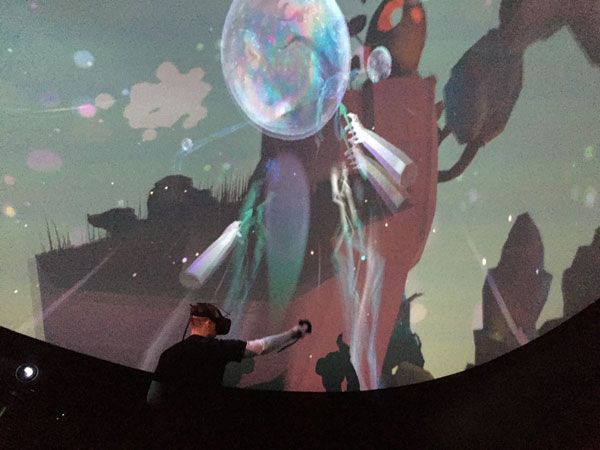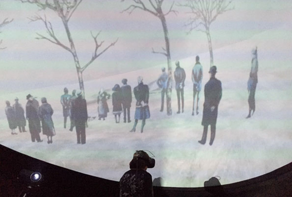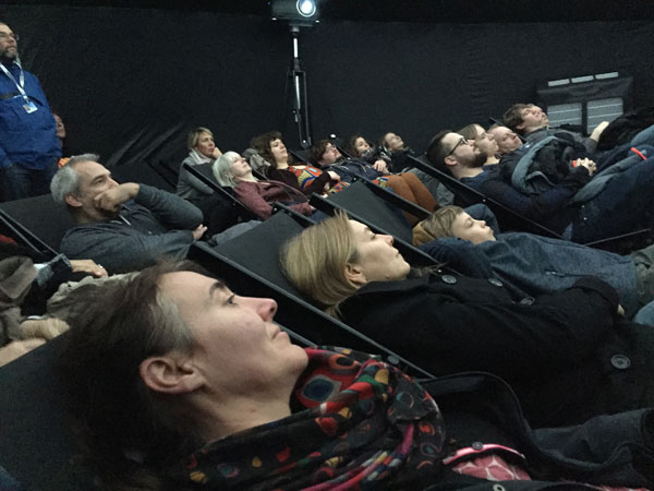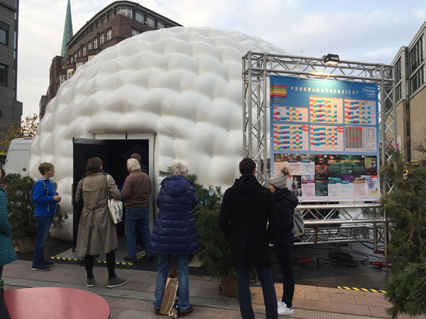 59. Nordische Filmtage Lübeck 2017Die Zukunft des filmischen Erzählens: Virtual-Reality und 360-Grad-Projektionen bei den NFL 2017Bei den Nordischen Filmtagen Lübeck gab es in diesem Jahr eine eigene Reihe mit 360-Grad-Projektionen und Virtual-Reality-Präsentationen im eigens im Stadtzentrum aufgestellten Fulldome. In kurzen, meist zweiteiligen Vorführungen konnte man den technischen Stand der Dinge bestaunen und sich ausmalen, wie Filmemacher zukünftig Immersive Medien und insbesondere die Möglichkeiten der Virtual Reality für das audio-visuelle Erzählen nutzen können. Initiiert und kompetent kuratiert wurde die Reihe von Ralph Heinsohn, Designer, Director und Producer von Immersiven Medien. Er stand und steht uns im Nachgang für Fachfragen zur Verfügung und hat für unsere Leser praktische Tipps für den Einstieg in die Virtuelle Welt (am Ende dieses Artikel) zusammengestellt. ![]() Der Fulldome bei den Nordischen Filmtagen Lübeck (Fotos: dakro)Die Präsentationen am Samstagnachmittag stehen stellvertretend für ein breit gefächsrtes Programm über die gesamte Laufzeit des Festivals: Während sich die meisten Besucher im Kuppeldome in Liegestühlen mit Blickrichtung Kuppeldecke entspannen konnten, wurde ein Gast mit VR-Headset ausgerüstet und in die virtuelle Welt des Kurzfilms „Nothing Happens“ entlassen. Was sich hinter der Brille abspielt, können die Liegenden als Projektion an der Kuppeldecke nachverfolgen. In der VR-Welt ist es natürlich möglich, die Blickrichtung zu ändern, um die Geschehnisse um sich herum wahrzunehmen. ![]() Mittels 360-Grad-Projektion verfolgen, was der Player in der Virtual Reality erlebtIn dem VR-Kurzfilm von Michelle und Uri Kranot wird nur nach aktivem Erkunden des Players klar, wo wir uns eigentlich befinden: Eine verschneite Landschaft, karge Bäume, in der Ferne ein Dorf. Eine kleine Gruppe Menschen versammelt sich, hinter uns spielt eine kleine Kapelle. Wir nehmen eine merkwürdige Unterperspektive ein: Stehen wir etwa in einem Grab, sind wir auf einer Beerdigung? Das herauszufinden, während sich um uns herum eine kurze Handlung entfaltet, macht den Reiz dieser kleinen VR-Welt aus. ![]() Die 360-Grad-Fulldome-Projektion zeigt die Perspektive des VR-PlayersRalph Heinsohn, Designer, Director und Producer von Immersiven Medien, und Nico Uthe, VR Nerds Hamburg, präsentieren als zweite Anwendung das interaktive VR-Spiel „Lucid Trips“, das sehr anschaulich die Möglichkeiten des Mediums zeigt. Während ein Player mit VR-Brille und bewegungsgesteuerten Controllern an den Händen sich durch die traumartige Landschaft eines fremden Planten bewegt, können die anderen Gäste im Fulldome wiederum das Geschehen am Kuppeldach verfolgen. „Lucid Trips“ ist eine im ersten Level einfach gehaltene VR-Variante eines Geschicklichkeitsspiels, bei dem es gilt, ein Gefühl für Raum und Geschwindigkeit zu entwickeln. Die Grafik läuft flüssig, und nach kurzer Eingewöhnung bewältigt auch der ungeübte Gamer das erste Level. Das sieht nach Spielspaß aus. Natürlich sind Games eine offensichtliche und erfolgsträchtige Anwendung für Virtual Reality. Heinsohn und Uthe führen aber insbesondere Visualisierungen von Lerninhalten und Wissenschaftsvisualisierungen als Anwendungen auf. In der Medizintechnik lassen sich z.B. Operationsvorbereitungen unter Einsatz von VR erweitern und verbessern. Vorstellbar sind auch VR-Präsentationen für Kultureinrichtungen und Museen (Sammelbegriff „Education“). Auch für Architekten und Makler kann Virtual Reality ein Tool für die Planung und Umsetzung von Bauvorhaben sein. ![]() Geschicklichkeitsspiele wie „Lucid Trips“ sind nur die Spitze des Eisbergs an kommerziellen AnwendungenDas Interesse an den Präsentationen im Kuppeldome ist groß. Heinsohn erklärt, dass man aber auch schon mit einfachen Mitteln, dem eigenen Smartphone und einer kostengünstigen VR-Brille, den ersten Schritt in die Virtual Reality machen kann. Es gibt bereits Apps, die insbesondere Dokumentationen und Dokumentarfilme für den Betrachter zum Download bereit halten. Wer einmal mitten in einem Protestzug in New York dabei sein will oder hautnah eine Ebola-Krise in einem afrikanischen Dorf miterleben will, sollte die App „WithIn“ testen und den ersten Schritt in eine größere (Medien-) Welt wagen. (dakro) Empfehlungen:Ralph Heinsohn, Designer, Director und Producer von Immersiven Medien, steht unseren Lesern dankenswerterweise für Fragen zur VR-Präsentation und 360-Grad-Projektion im Kuppeldome gerne zur Verfügung: info@ralphheinsohn.com. Der Blog von Nico Uthe und den VR Nerds Hamburg ist eine nachdrückliche Empfehlung von Ralph Heinsohn. Dort finden sich kompetente Informationen zu Hardware, Videos, Games, Tests, Tutorials rund um die Themen VR, Augmented Reality, 360-Grad etc. Für den Einstieg in 360-Grad-Medien empfiehlt es sich, die Apps „WithIn“ und „Arte 360 Grad“ zu probieren. Dort sind kuratierte 360-Grad-Filme abgelegt, die man sich kostenlos aufs Smartphone laden kann. Das c’t Sonderheft „Virtual Reality“ (Heise Verlag) erschien zwar schon 2016, wurde aber seitdem mehrmals neu aufgelegt. Ihm liegt eine VR-Brille aus Pappe bei; mit dem eigenen Smartphone kann man dann sogleich in die VR-Welt einsteigen. Zum Thema siehe auch folgende Artikel auf infomedia-sh: VR-Headsets im Low-Cost-Bereich: